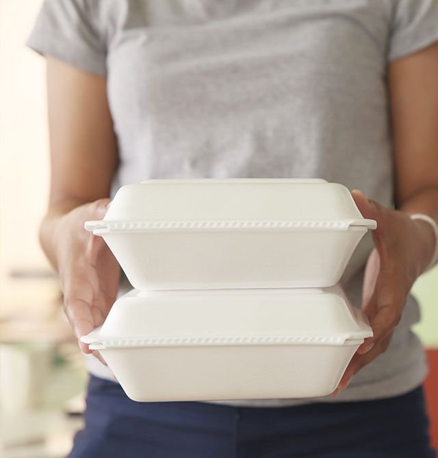 Copos, pratos, bandejas, hamburgueiras, potes diversos, cumbucas e caixas térmicas.